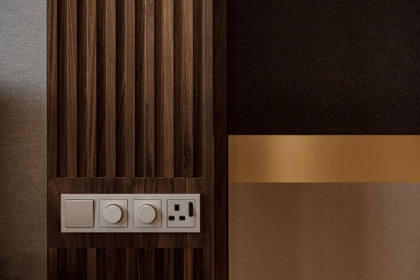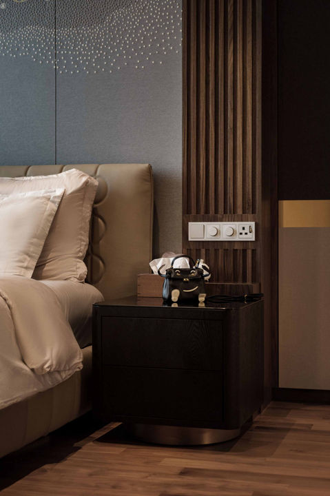 The powder room stands as a testament to refined luxury, with pristine marble surfaces creating an air of sophistication. In the master bedroom, a custom embroidered wallpaper behind the headboard adds texture and a touch of opulence. Fluted panels and gold metal laminate are strategically incorporated around the house, featured in the wardrobe and living room ceiling, adding depth and warmth to the interiors. This project is a seamless blend of modern luxury, intricate detailing, and timeless design.