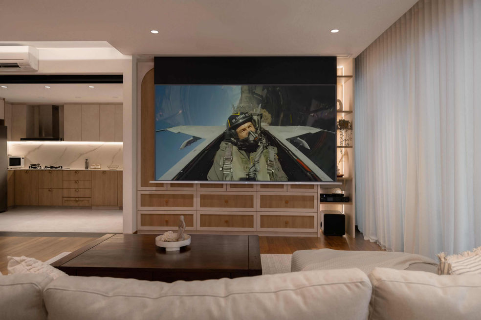 In this Seafront Condo transformation, we’ve tailored the design to create a stylish and spacious haven for hosting. By converting three bedrooms into two, we’ve opened up the layout to prioritize comfort and flow. For the owners who love entertaining, a sleek bar has been integrated into the dry kitchen, serving as a perfect gathering spot for guests. This area is divided from the wet kitchen by a sliding glass door, allowing both functionality and style.