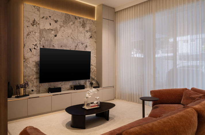 The Seletar View project embodies refined modern living through its balance of warmth, texture, and clean architectural lines. The master bedroom is designed as a serene retreat, where soft lighting, earthy tones, and an upholstered headboard create an enveloping sense of comfort. Underbed lighting and muted drapery enhance the cozy yet sophisticated ambiance, while custom built-in furniture maintains a seamless aesthetic throughout.