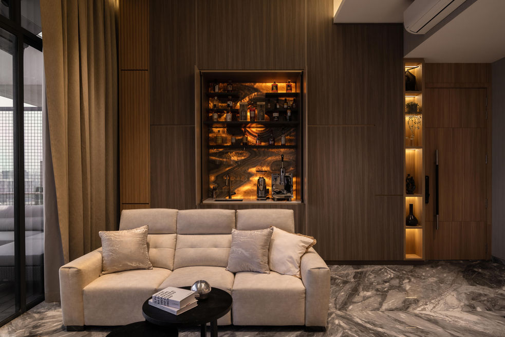The design embraces the beauty of natural materials, with extensive use of wood, stone, veneer, and linen to create a rich, tactile experience throughout the condo. Leather accents are woven into the decor, adding a layer of luxury and warmth. The combination of these authentic materials enhances the overall ambiance, making the space feel both contemporary and grounded, with an emphasis on natural textures that evoke a sense of coziness.